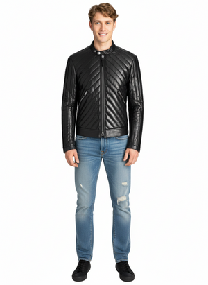 Discover the perfect blend of style and comfort with our Black Quilted Leather Moto Jacket. Handcrafted by Pakistani artisans with over 50 years of experience, this 100% genuine sheepskin leather jacket showcases an exquisite chevron quilting.